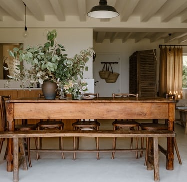 Emphasizes raw and tactile surfaces: exposed stone walls, plaster, and hand-hewn beams.