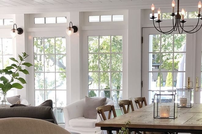Painted wood paneling and shiplap are key architectural features.